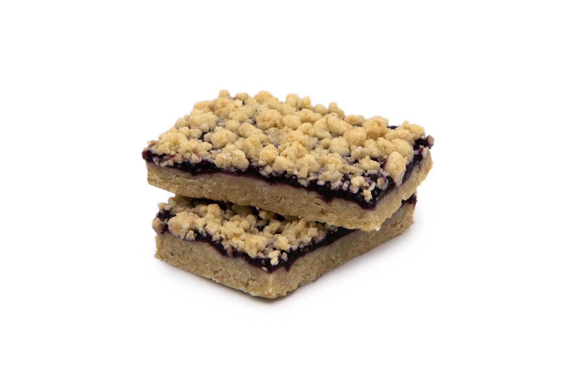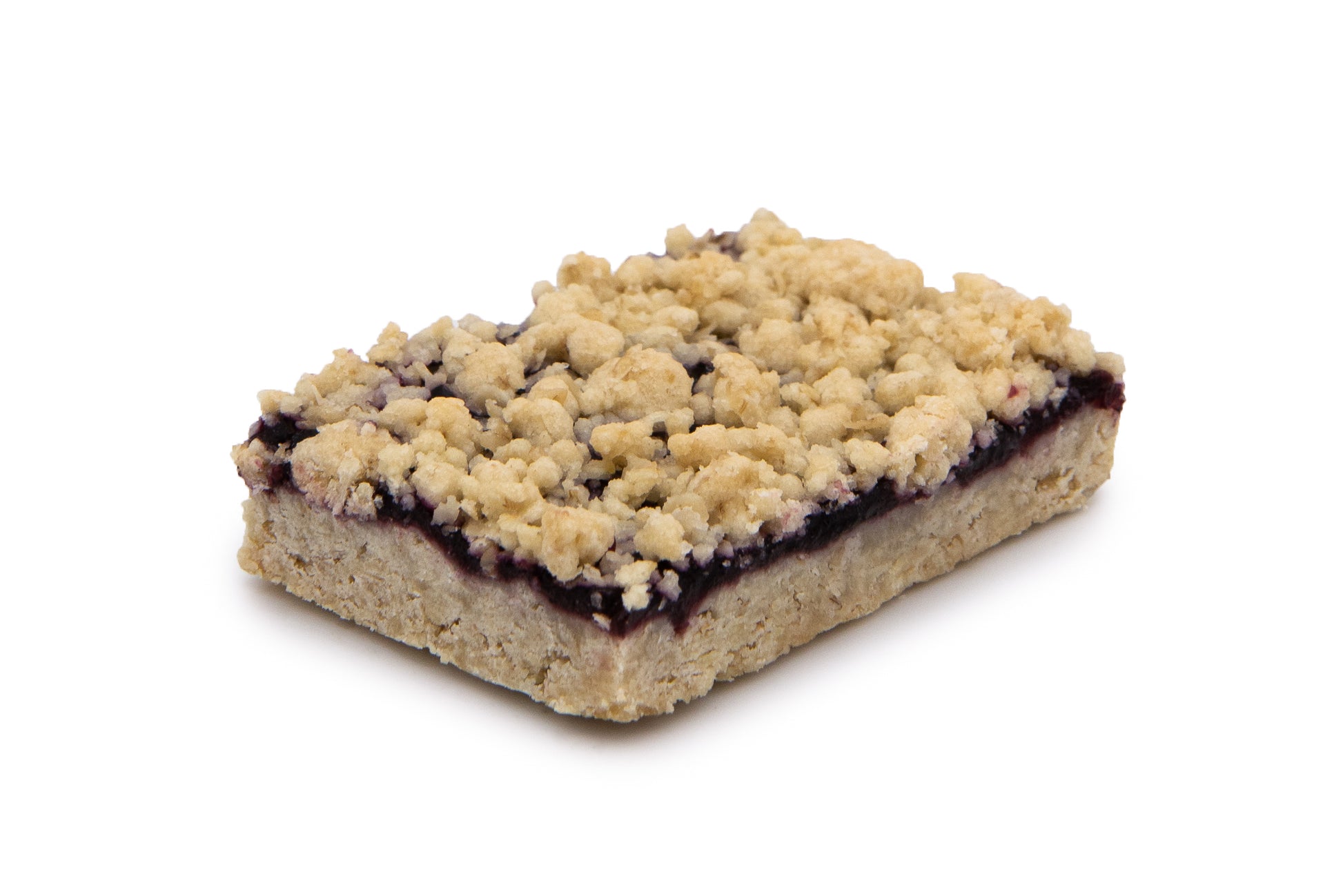 A classic fruit crumble bar filled with blueberry preserves and topped with a buttery crumb layer.