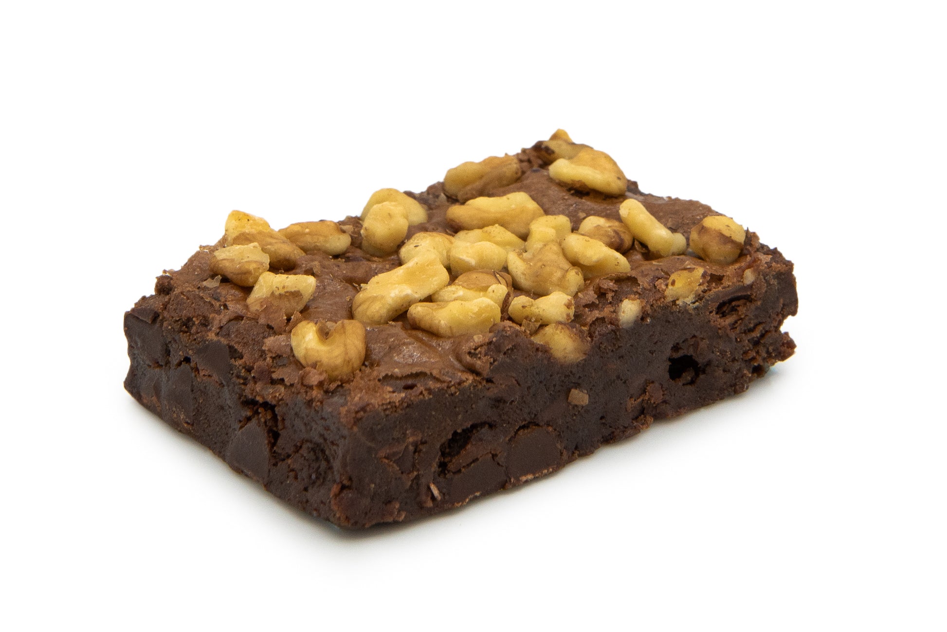 Dense chocolate batter in combination with the texture of whole chocolate chips topped with walnut pieces.