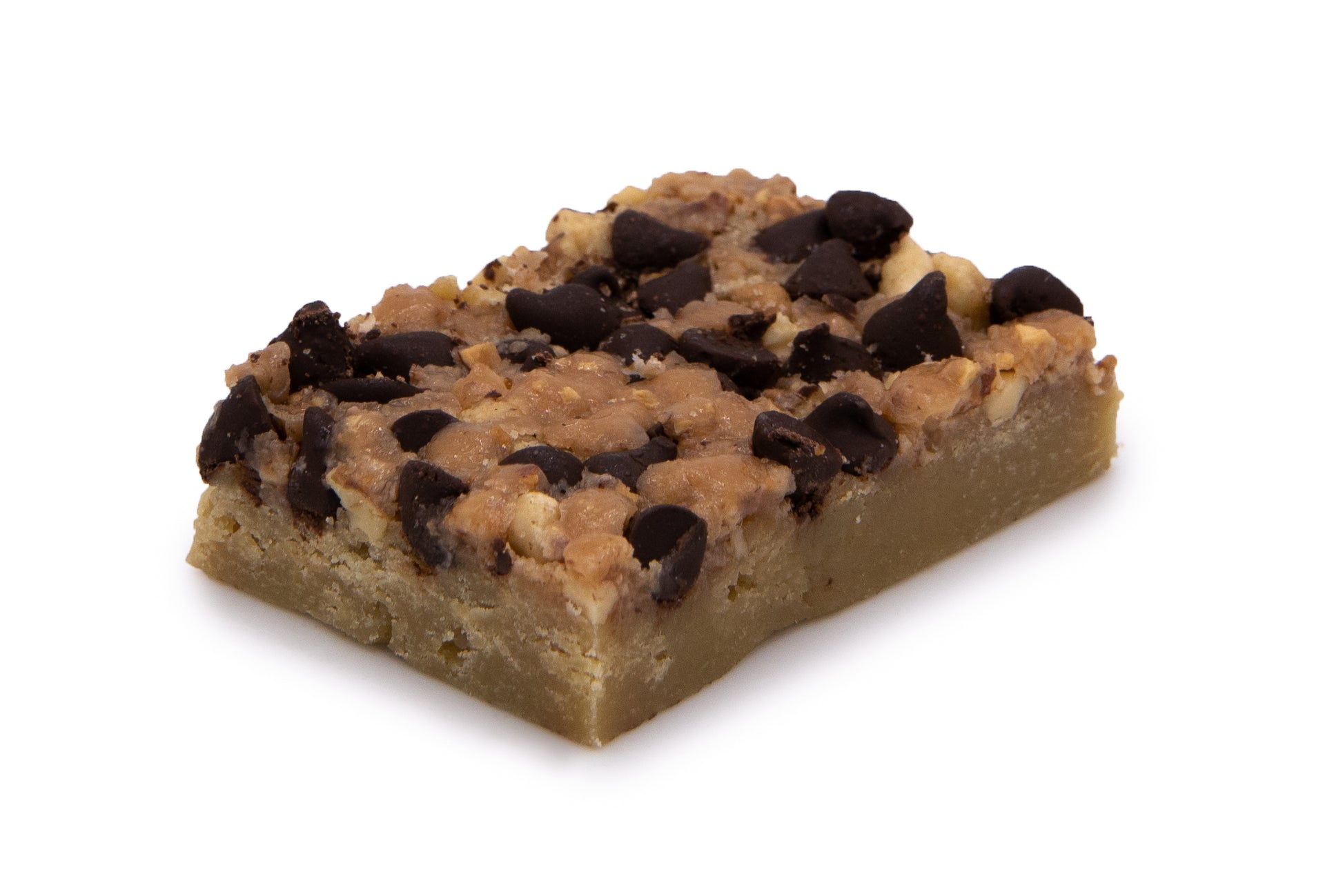 Ingredients: untreated wheat flour, brown sugar, butter, toffee, Non-GMO Premium Vegetable Blend (Palm Oil, Palm Fractions, Water, Salt, Emulsifiers [Soya Lecithin, Distilled Monoglycerides], Natural Butter Flavour, Citric Acid, Antioxidant [Mixed Tocopherol {Soy-Derived}], Vitamin A & Colouring [Beta-Carotene]), semisweet chocolate chips (sugar, chocolate liquor, cocoa butter, dextrose, lecithin, vanilla), whole eggs, walnuts, vanilla, salt.