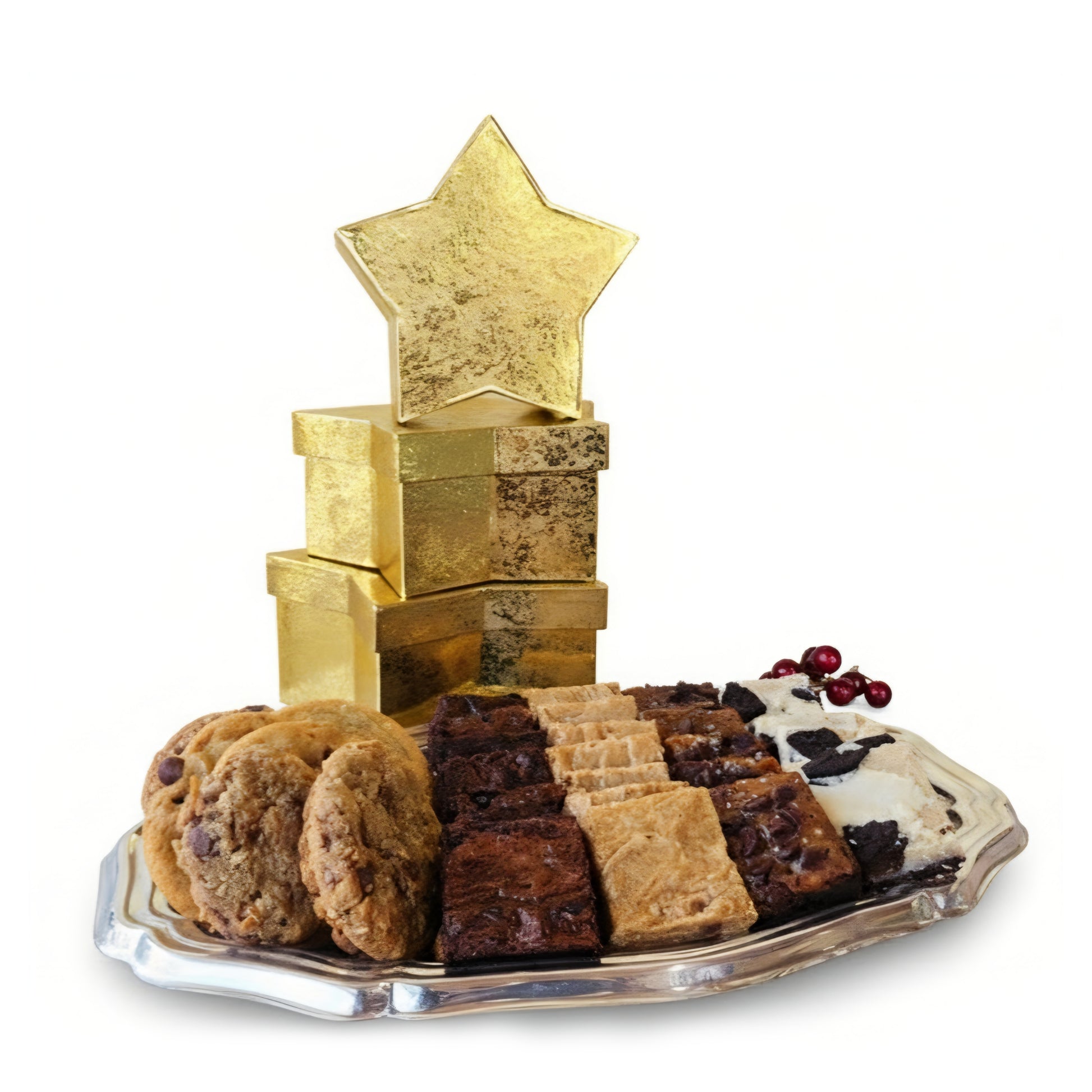A perfect little indulgence! This tower features 26 hand-picked pieces, including a generous portion of 20 of our signature, brownies and 6 cookies, beautifully stacked and ribbon-tied. It's an ideal thank-you gift, a thoughtful office treat, or a delightful personal sampler.