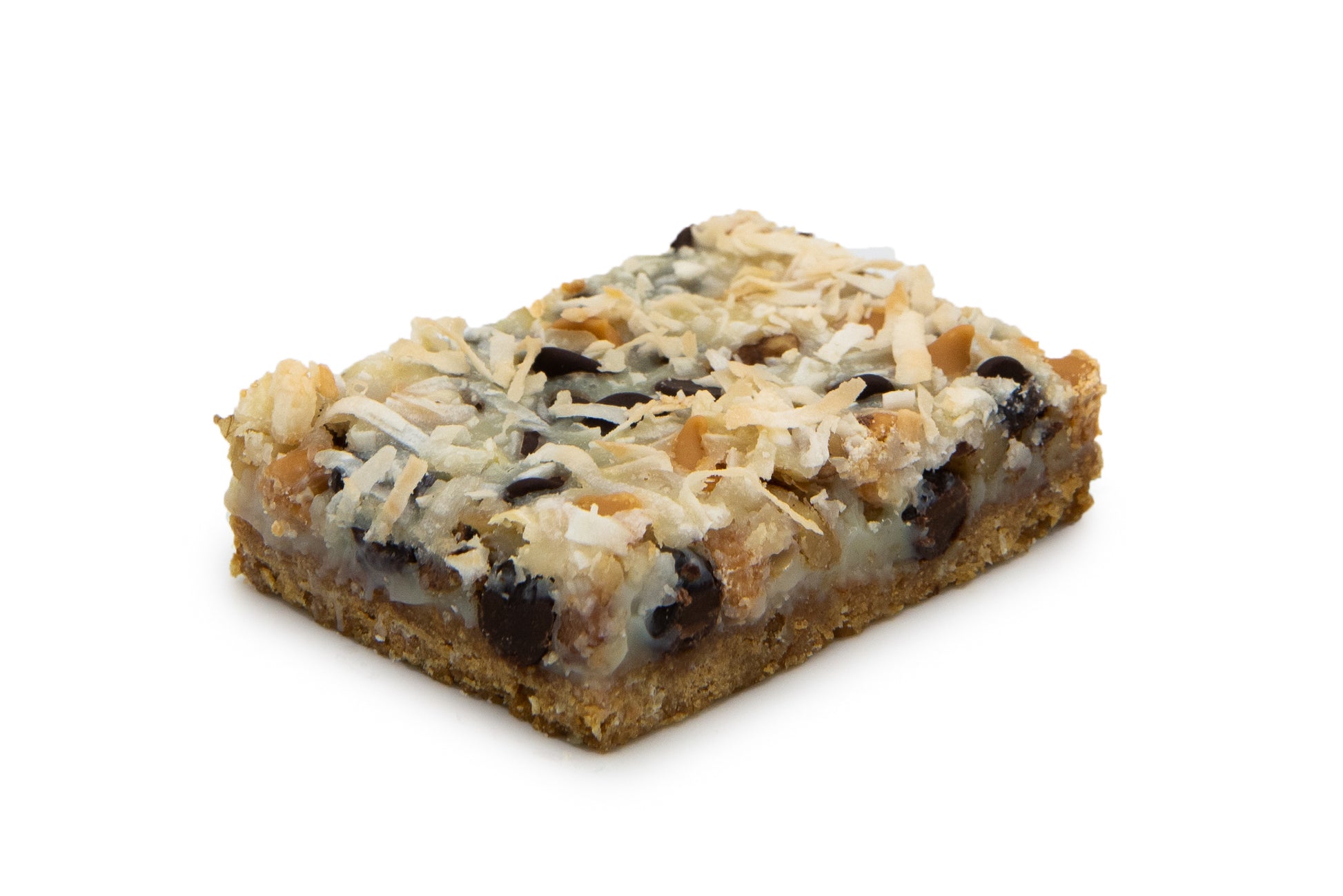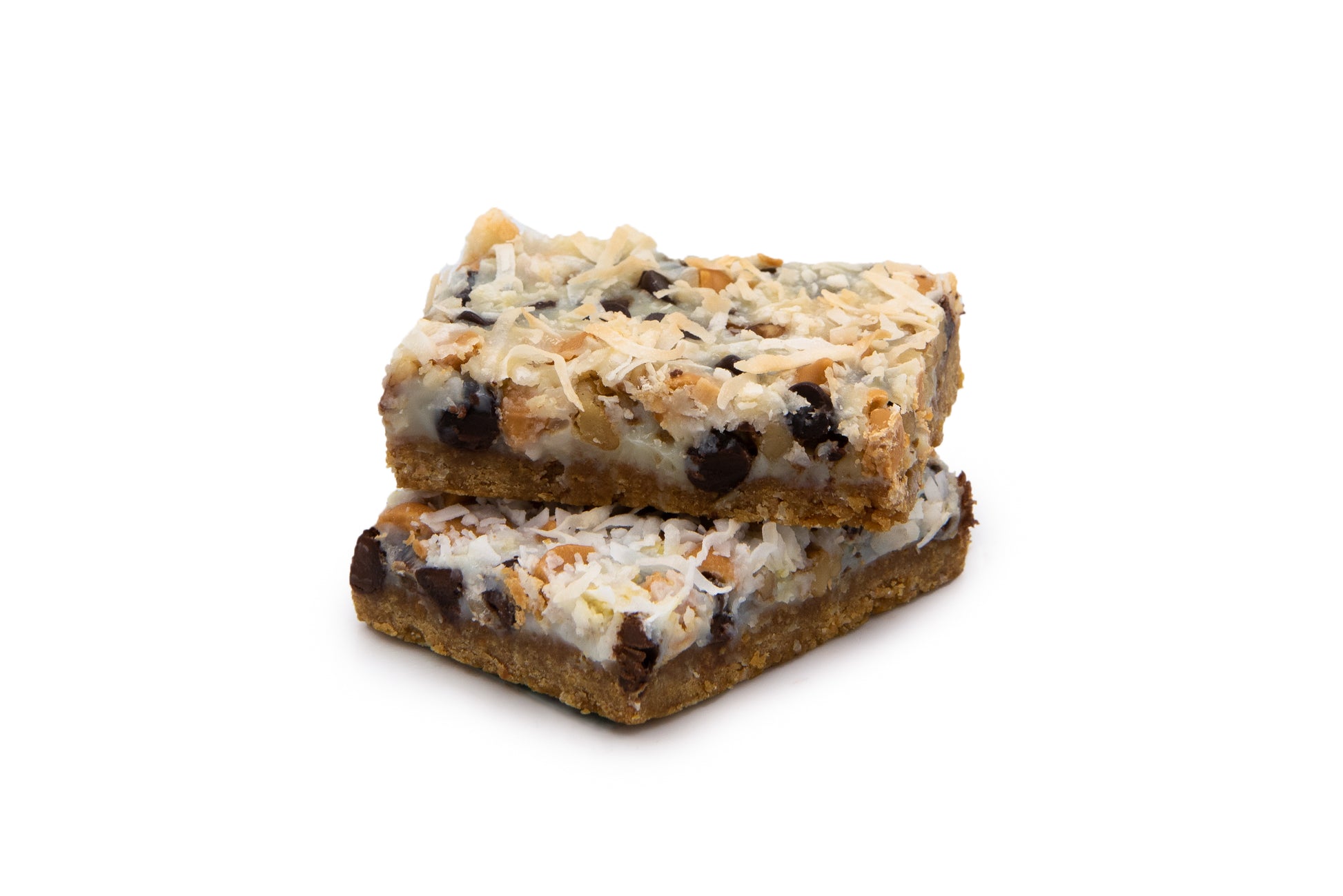 A true homemade style treat. Graham cracker crust, condensed milk, coconut, chocolate chips, butterscotch drops, and walnuts, all layered in for crunchy melty goodness