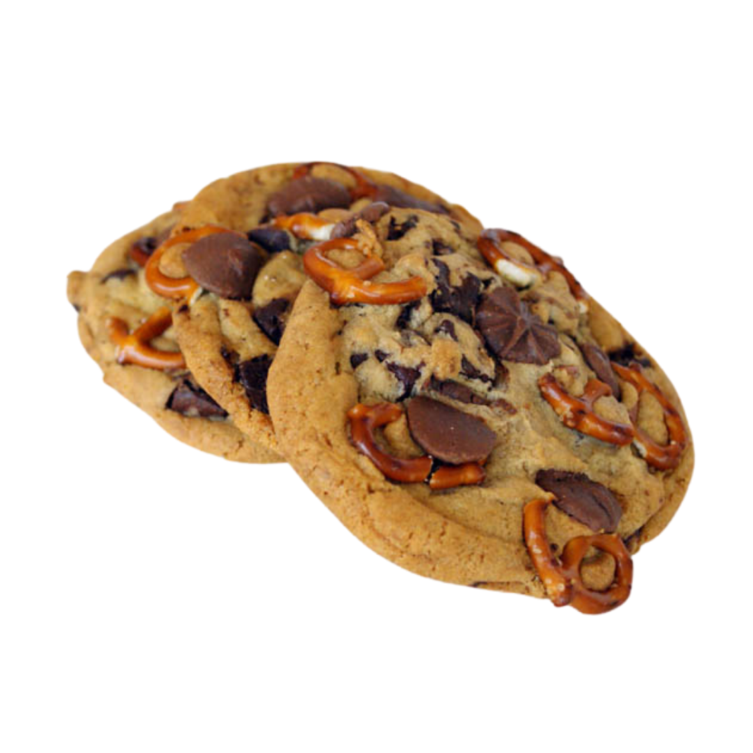 A Chocolate Chunk Cookie decorated with loads of pretzels and milk chocolate disks. A perfect blend of sweet and salty.
