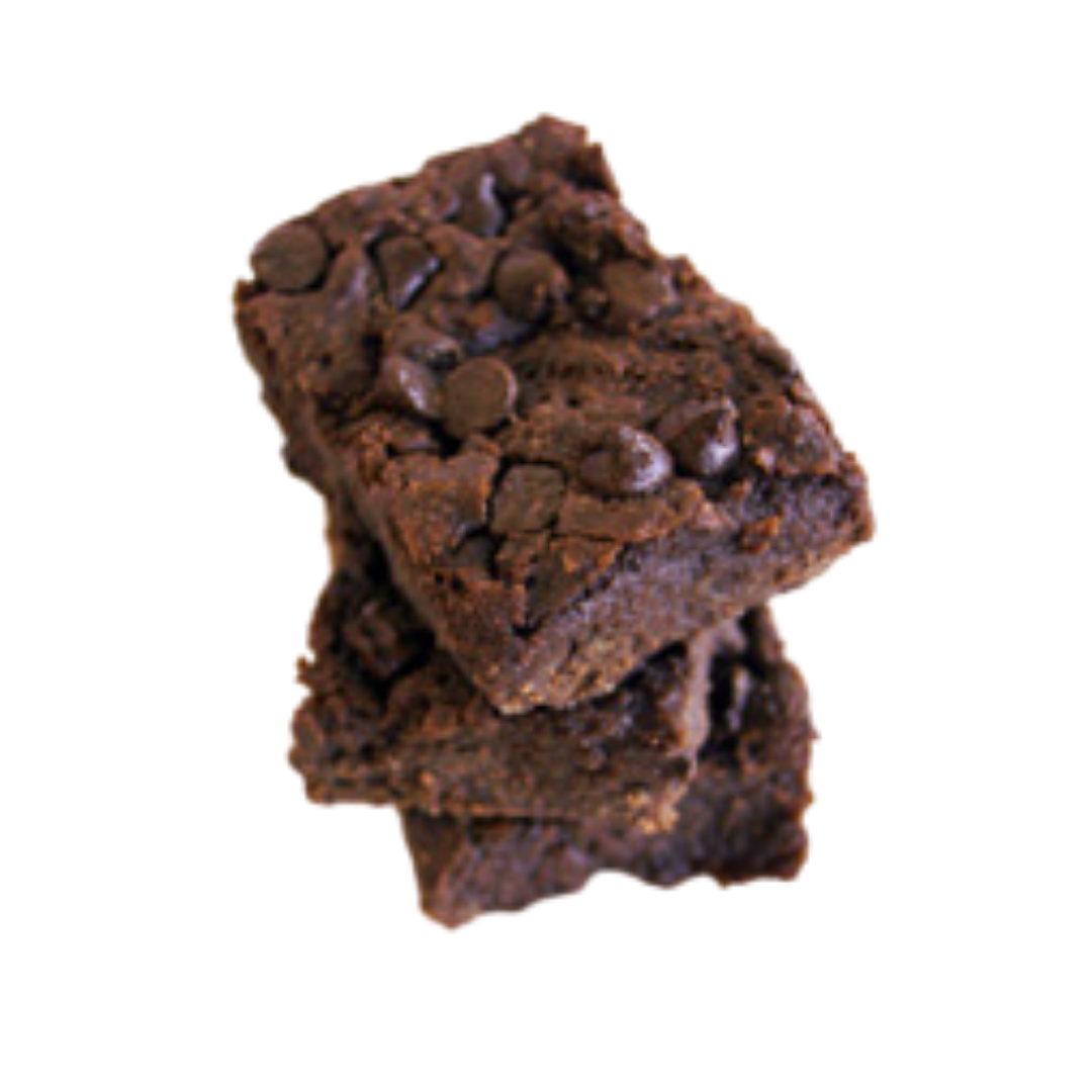Deep rich vegan chocolate brownie topped with semisweet chocolate chips with the added hardy texture and chewiness of ground flaxseed.